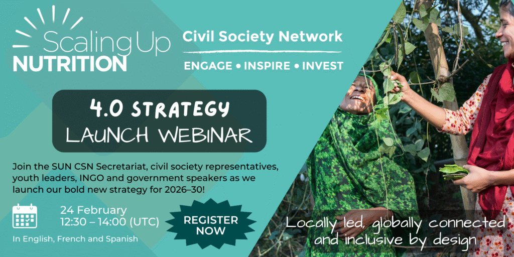 Join us for a 90-minute high-level, interactive conversation marking the launch of the SUN Civil Society Network 4.0 Strategy – a defining moment for civil society’s role in delivering SUN 4.0.